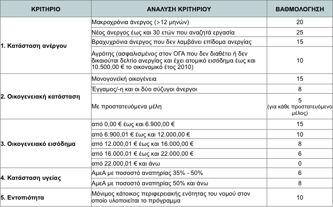 1. Η κατάταξη των υποψηφίων γίνεται κατά φθίνουσα σειρά σε ενιαίο πίνακα με αναγραφή των κωδικών θέσεων που έχουν επιλέξει, με βάση τη συνολική βαθμολογία που συγκεντρώνουν από τα βαθμολογούμενα κριτήρια (Κατάσταση ανέργου, Οικογενειακή κατάσταση κ.ο.κ.).